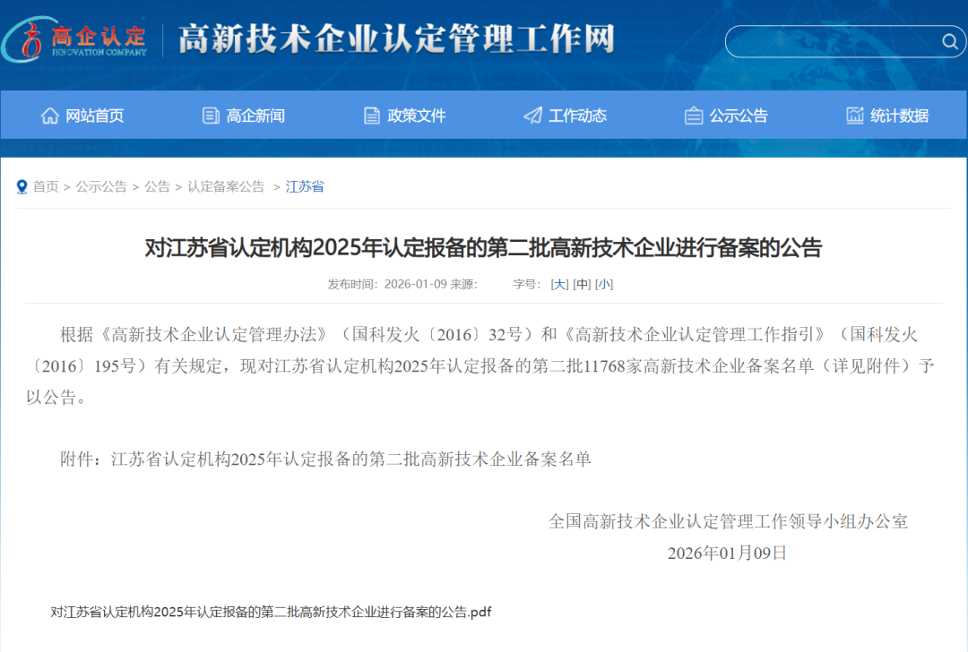 近日,根据《高新技术企业认定管理办法》及相关规定,全国高新技术企业认定管理工作领导小组办公室对江苏省认定机构2025年认定报备的第二批企业进行备案公示。555000jcjc公海凭借其扎实的科技创新实力与完善的研发管理体系,成功荣列在本次备案中。