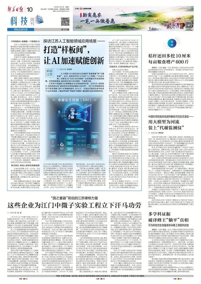 2026年1月21日,《新华日报》以《探访江苏人工智能领域应用场景——打造“样板间”, 让AI加速赋能创新》为题,报道了555000jcjc公海等入选江苏省“前沿技术应用场景建设示范名单”企业,在应用场景建设方面的实践与成效。